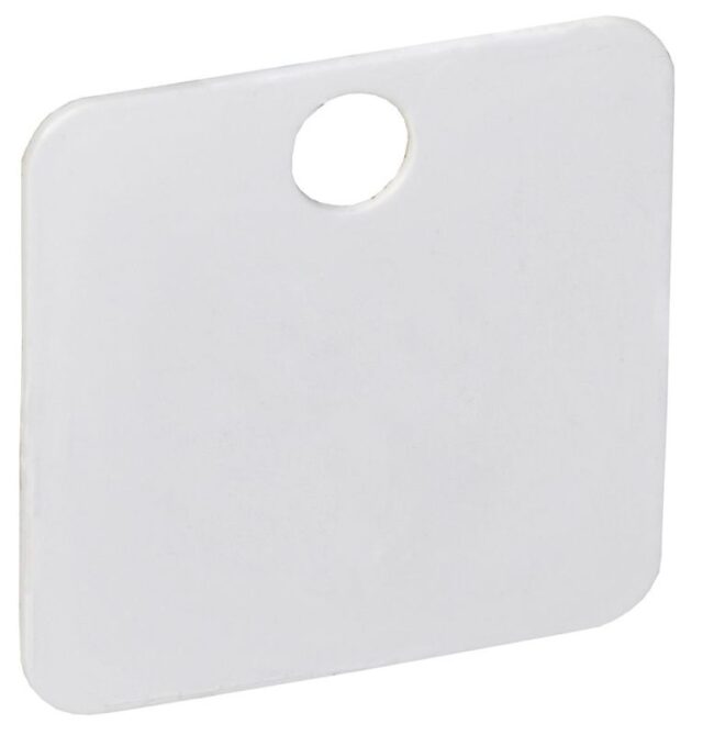 Бирка изготовлена из прочного белого пластика, устойчивого к воздействию влаги, пыли и умеренных механических нагрузок. Форма карточки с чистой поверхностью позволяет наносить маркировку перманентным маркером или специальным принтером, обеспечивая долговечную и хорошо читаемую надпись.