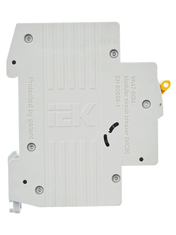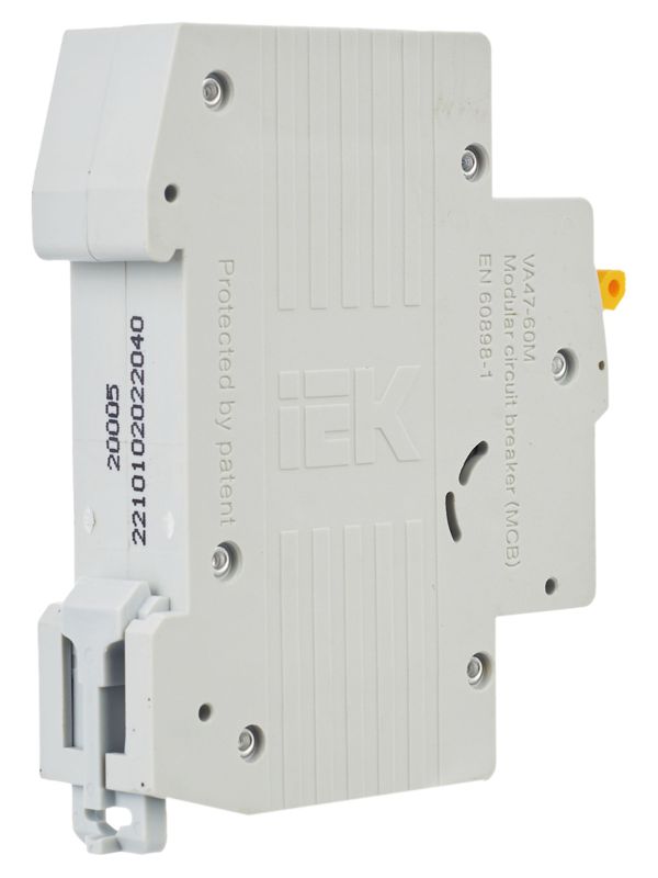 Ключевые преимущества выключателя включают компактность (всего 1 модуль по ширине), удобный монтаж и долговечный механизм. Степень защиты IP20 обеспечивает безопасную эксплуатацию в закрытых электрощитах. Аппарат соответствует стандарту IEC 60898, что подтверждает его высокое качество и надежность.