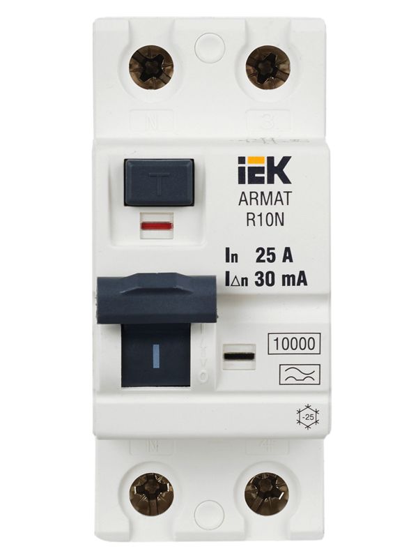 Надежная защита жизни и имущества: двухполюсное УЗО ARMAT R10N от IEK с номинальным током 25А и чувствительностью 30 мА. Это устройство мгновенно реагирует на утечку тока типа А, предотвращая риск поражения электрическим током и возгорания из-за повреждения изоляции.