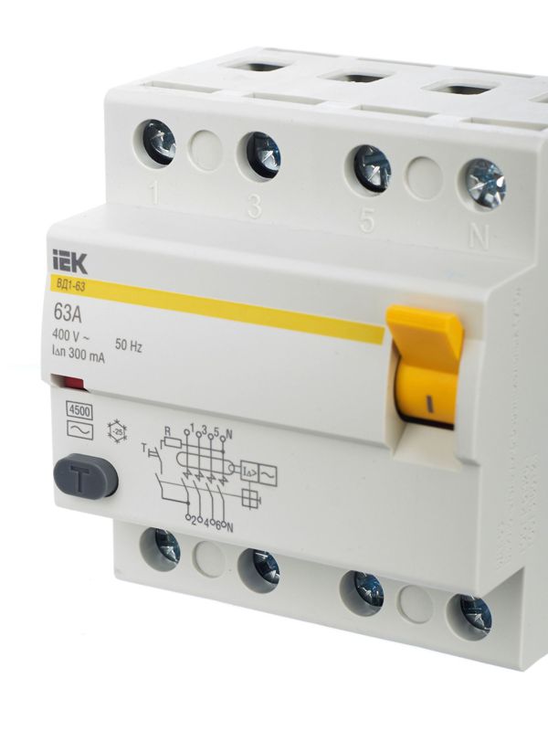 Выключатель дифференциального тока ВД1-63 KARAT от IEK — это надежное и быстродействующее устройство защитного отключения (УЗО), предназначенное для обеспечения безопасности людей и имущества. С номинальным током 63А и чувствительностью 300 мА оно эффективно предотвращает риски поражения электрическим током и возникновения пожаров из-за утечек на землю.