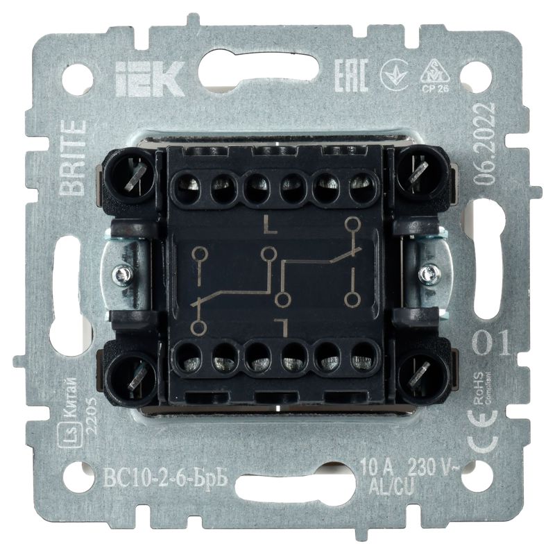 Проходной выключатель IEK BRITE — это современное и надежное решение для организации управления освещением из двух точек. Модель ВС10-2-6-БрБ с двумя клавишами и номинальным током 10А позволяет создавать удобные и энергоэффективные схемы освещения в жилых и коммерческих помещениях.