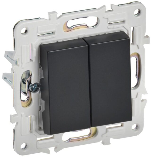 Выключатель изготовлен из ударопрочного поликарбоната, устойчивого к УФ-излучению, что гарантирует сохранение насыщенного черного цвета. Луженая контактная группа с серебряным напылением обеспечивает надежное соединение и долгий срок службы. Самозажимные клеммы значительно ускоряют и упрощают процесс установки.