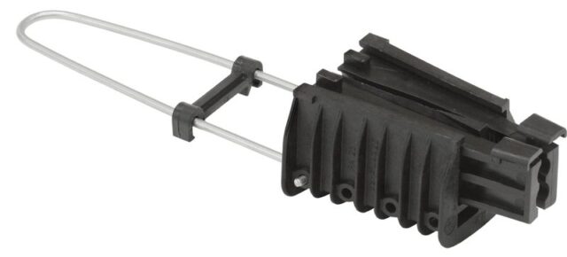 Ключевые преимущества зажима включают простоту монтажа без специального инструмента и уникальную конструкцию. Рельефные клинья надежно фиксируют провод, предотвращая его выскальзывание даже при высоких нагрузках, не повреждая изоляцию. Все компоненты изготовлены из УФ-стойких полимеров и оцинкованной стали, что гарантирует устойчивость к коррозии и любым погодным условиям. Легкосъемная дужка с фиксатором и регулируемой длиной (90–150 мм) обеспечивает удобное и безопасное крепление к кронштейнам.