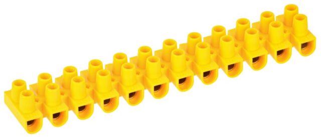 Ключевые преимущества модели включают корпус из негорючего полистирола желтого цвета, который обеспечивает высокий уровень электроизоляции и защиту от замыканий. Боковое расположение присоединения и винтовые зажимы гарантируют удобный монтаж и надежный долговечный контакт. Широкий температурный диапазон эксплуатации от -25°C до +110°C позволяет использовать колодку в сложных условиях.