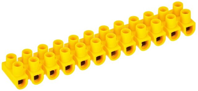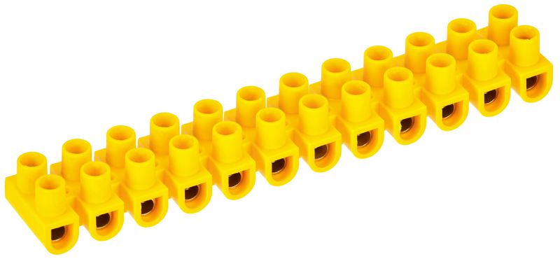 Ключевые преимущества модели включают корпус из негорючего полистирола желтого цвета, который обеспечивает высокий уровень электроизоляции и защиту от короткого замыкания. Боковое расположение винтовых зажимов облегчает монтаж и обеспечивает надежную фиксацию как однопроволочных, так и многопроволочных гибких проводников.