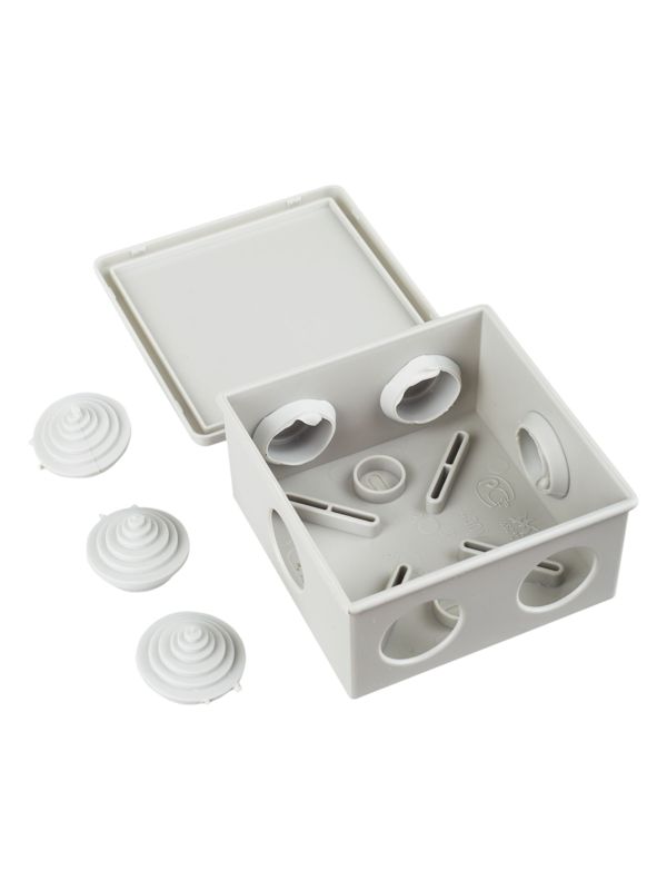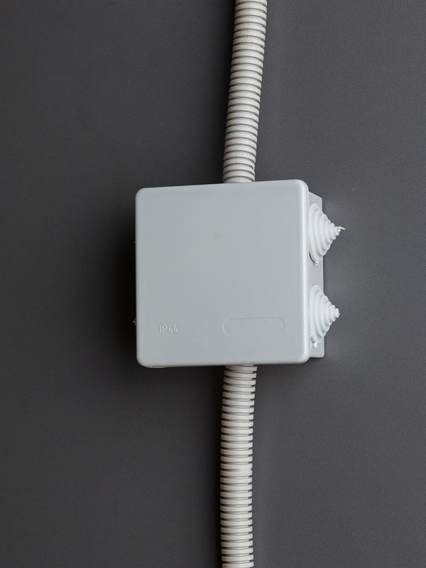 Коробка предназначена для открытого монтажа на стены или потолок и идеально подходит для использования в составе систем с жесткими и гофрированными трубами. Благодаря степени защиты IP44 ее можно применять во влажных и пыльных помещениях, а также для наружной установки, что значительно расширяет область применения от промышленных объектов до бытовых подсобных зон.