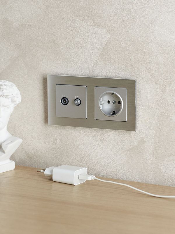 Широкая цветовая гамма и использование материалов премиум-класса в серии BRITE дают возможность реализовать самые смелые дизайнерские задумки. Рамка выполнена в популярном цвете "Алюминий", который легко интегрируется в современные интерьеры.