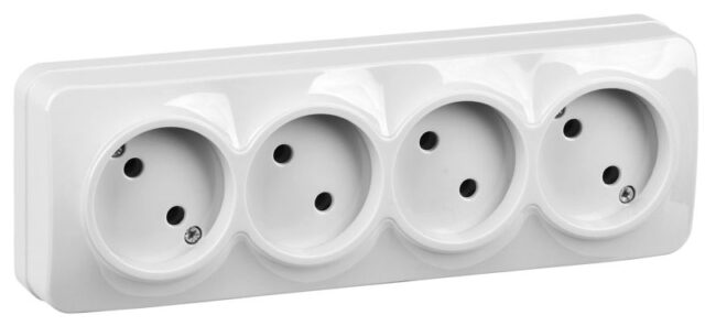Четырехместная конструкция розетки позволяет одновременно подключать несколько электроприборов, что делает ее идеальным выбором для кухонь, офисов, мастерских или гостиных. Изделие предназначено для открытой установки и рассчитано на номинальный ток 10А при напряжении 230В, гарантируя безопасную и стабильную работу бытовой техники и электроники.