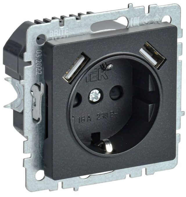 Розетка BRITE от IEK — это современное решение для организации удобных и безопасных точек питания в жилых и коммерческих помещениях. Модель РЮш10-1-БрЧ сочетает в себе классическую розетку на 16А с заземлением и два порта USB для зарядки устройств с суммарным током 2.1А. Стильный матово-черный механизм выполнен из качественного термопласта и соответствует строгим стандартам серии.