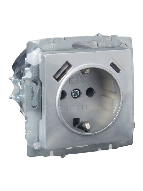 Розетка BRITE от IEK — это современное решение для организации удобных и безопасных точек питания. Модель РЮш11-1-БрА сочетает в себе классическую розетку на 16А с заземлением и два высокоскоростных USB-порта типа A и C суммарной мощностью 18Вт. Стильный алюминиевый механизм в матовом исполнении и защитные шторки делают её идеальным выбором для современного жилого или коммерческого пространства.