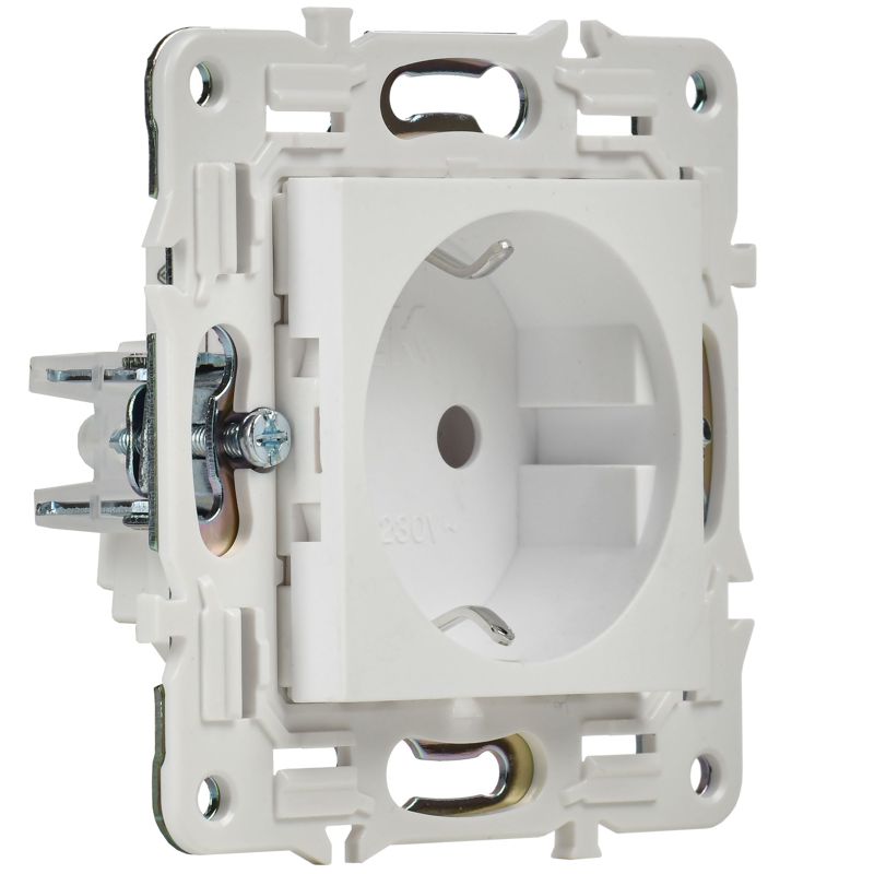 Ключевые преимущества розетки включают высокую надежность и долговечность, обеспеченные механизмом из луженой латуни и корпусом из ударопрочного поликарбоната. Винтовые клеммы гарантируют прочное и безопасное соединение проводов, а двойной изолированный суппорт обеспечивает дополнительную защиту при монтаже. Процесс установки упрощен благодаря удобной клипсовой фиксации рамки.