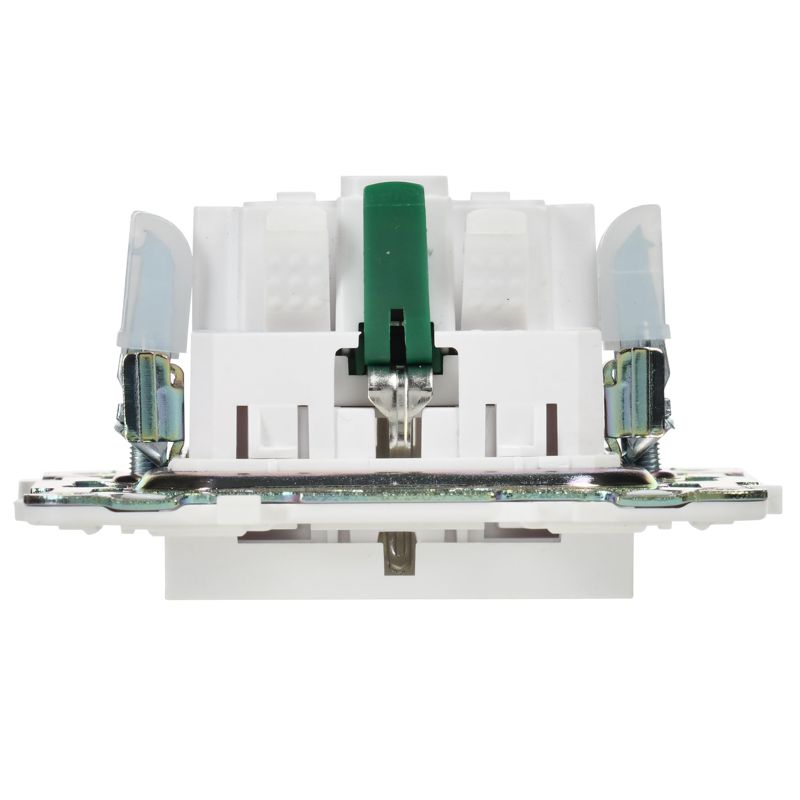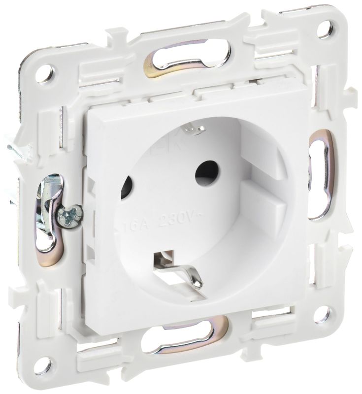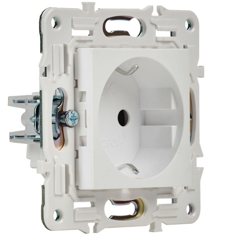 Ключевые преимущества розетки включают луженую токопроводящую группу и корпус из высококачественного поликарбоната для максимального срока службы. Надежное подключение проводов обеспечивается винтовыми клеммами, а двойной изолированный суппорт с защитной накладкой повышает безопасность во время электромонтажа. Механизм с заземлением стандарта SCHUKO гарантирует безопасную эксплуатацию мощной техники.