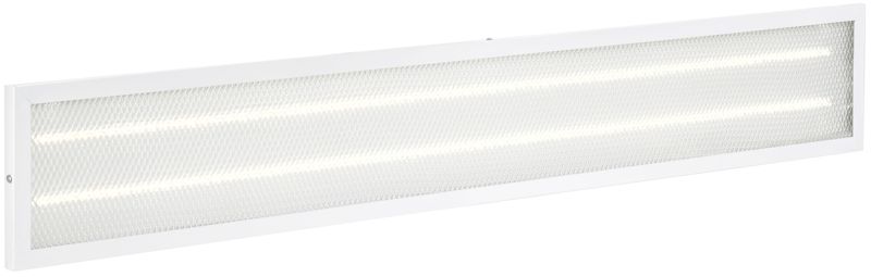 Применяется в магазинах, складах, офисах и общественных пространствах. Подходит для накладного, подвесного и настенного монтажа. Полистироловый рассеиватель с призматической структурой создает равномерное симметричное освещение, соответствующее стандарту EN 12464-1 для рабочих мест с мониторами.